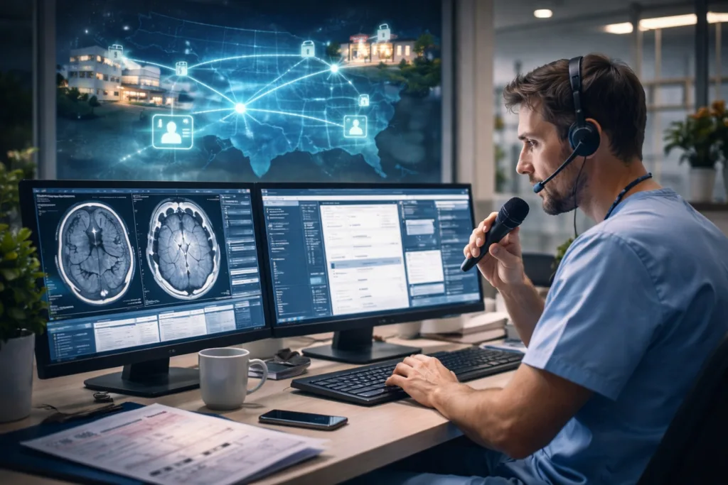 Radiology sits at the center of this transformation. A rural hospital uploads a CT scan at 3 AM. Fifteen minutes later, a neuroradiologist in Florida sends back a stroke protocol interpretation. Treatment starts immediately.